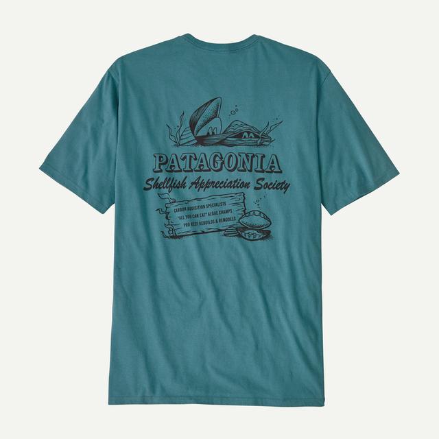 Because this tee is made of organic cotton, it uses 84% less water and creates 16% less CO2 than a conventional cotton T-shirt. Made in a Fair Trade Certified factory. | Patagonia Men's Aquatic Action Organic Cotton T-Shirt in Wetland Blue, XL - Short Length - Logo T-Shirts